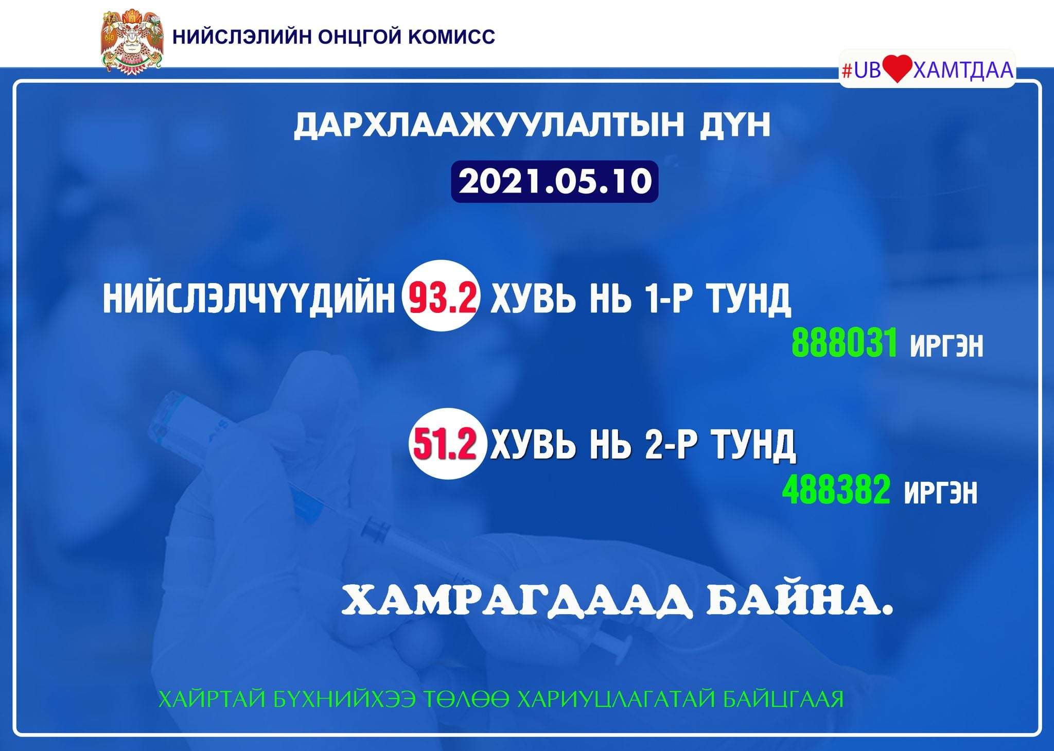 Өчигдөр нийслэлийн хэмжээнд I тунд 5131, II тунд 2091, нийт 7222 иргэнийг дархлаажуулалтад хамрууллаа. Вакцинжуулалт эхэлснээс хойш нийслэлийн 18-аас дээш насны иргэдийн
