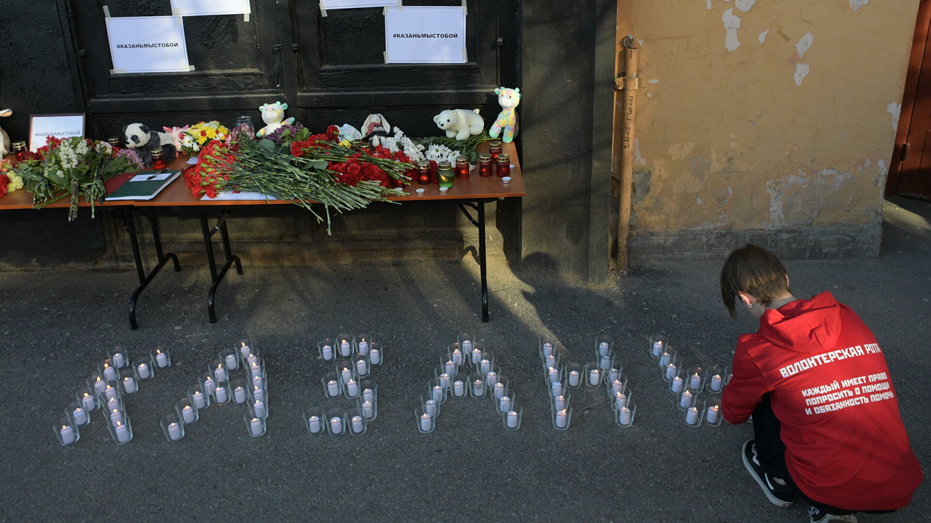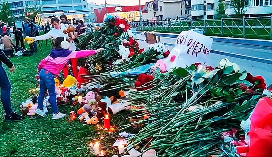 Харин Казань хотын эмгэнэлт явдал гарсан сургуулийг олон зуун хүн зорин очиж, лаа асаан, лаагаар сургуулийн дугаарыг дүрслэн, цэцэг өргөжээ. Түүнчлэн хотын бусад хэсгүүдэд ч дурсгалын цэгүүдийг бий болгосон байна. Сургуулийн ойролцоох хэсэгт хүмүүс олноор цугларсан тул цагдаагийнхан зохицуулж, цөөн хүмүүсийг оруулан, хүмүүс эмгэнэл илэрхийлэхийн тулд урт дараалал үүсгэн зогсжээ. Хүмүүс цэцэг, тоглоом, лаа авчран, таксины жолооч нар сургууль руу явж байгаа хүн бүхнийг үнэ төлбөргүй зөөж байсан талаар Регнум агентлаг мэдээлсэн байна.