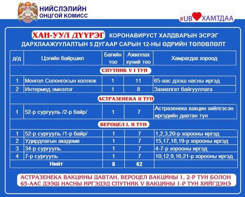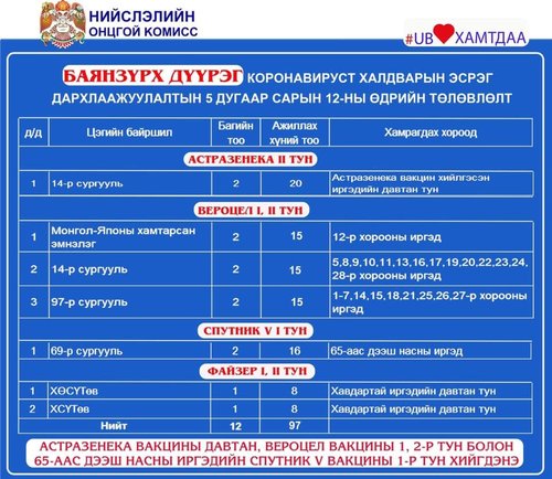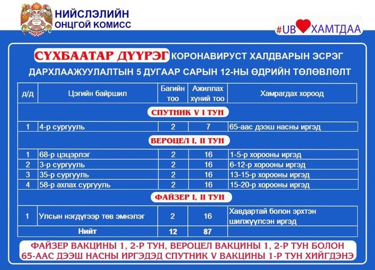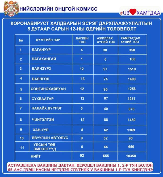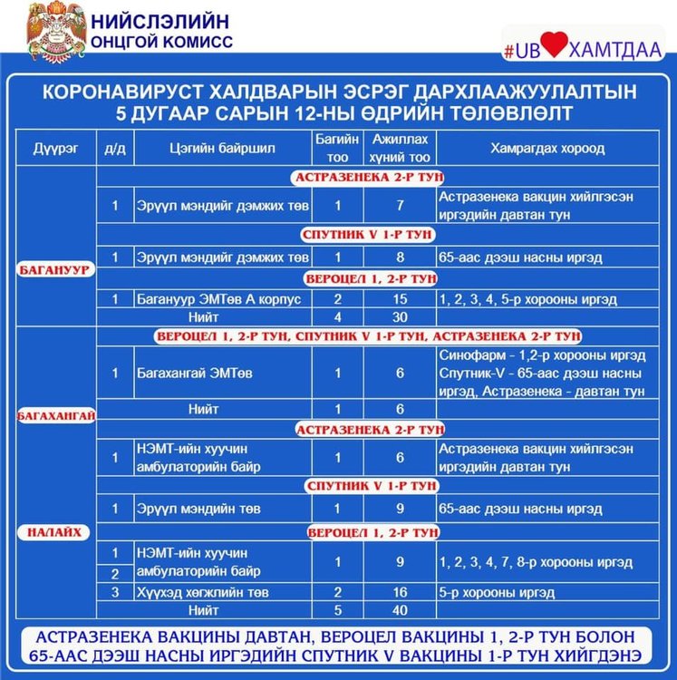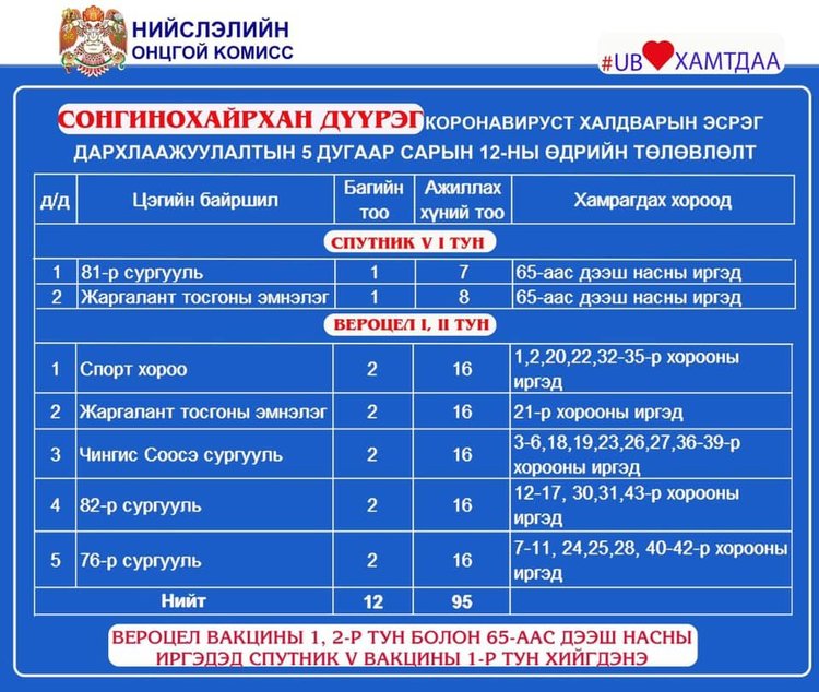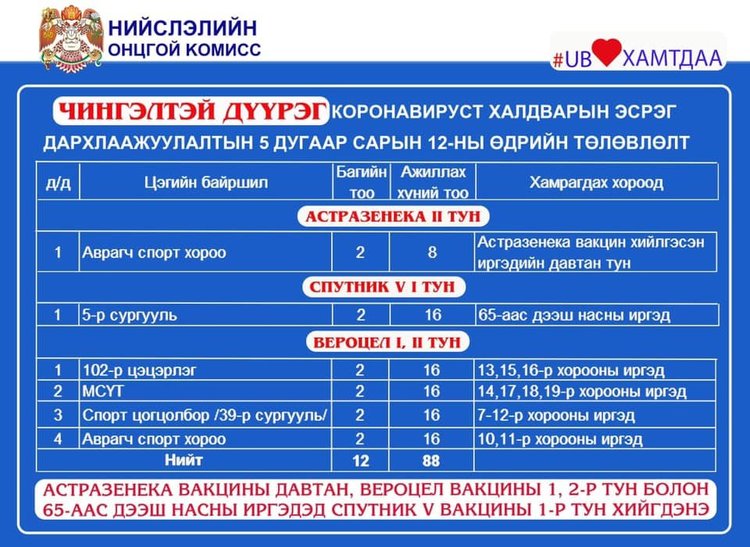Өнөөдөр Улаанбаатар хотод суурин 42 цэгт, явуулын 8 автобусаар 92 багийн 655 эмч, ажилтан ажиллаж, 10358 хүнийг дархлаажуулахаар төлөвлөлөө. Дархлаажуулалтын цэгийг дүүрэг тус бүрээр танилцуулж байна.