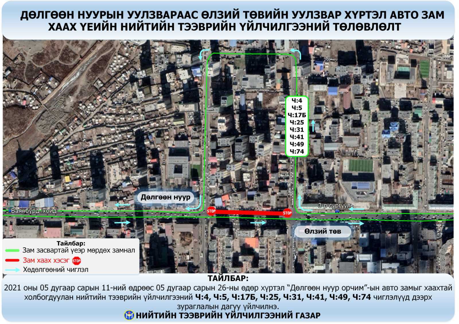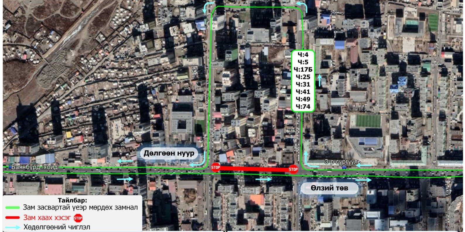 Дөлгөөн нуурын уулзвараас Өлзий төвийн уулзвар хүртэлх авто замыг тавдугаар сарын 11-26-ныг хүртэл хааж, шугам засварын ажлыг хийх болсонтой холбогдуулан нийтийн тээврийн есөн чиглэлд өөрчлөлт орж байна. Тодруулбал,