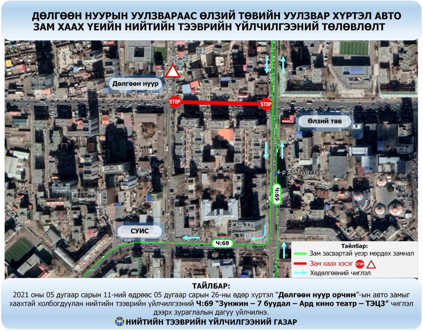 Ч:69 “Зунжин 7 буудал- Ард кино театр-ТЭЦ-3” чиглэл доорх зураглалын дагуу хөдөлгөөнд оролцоно.
