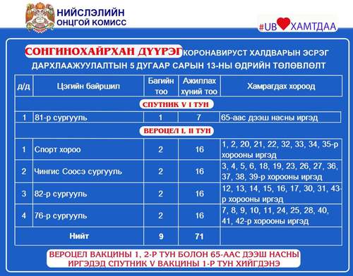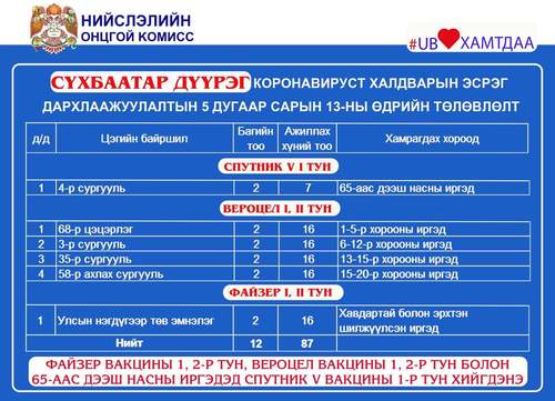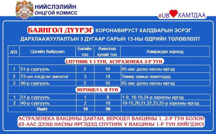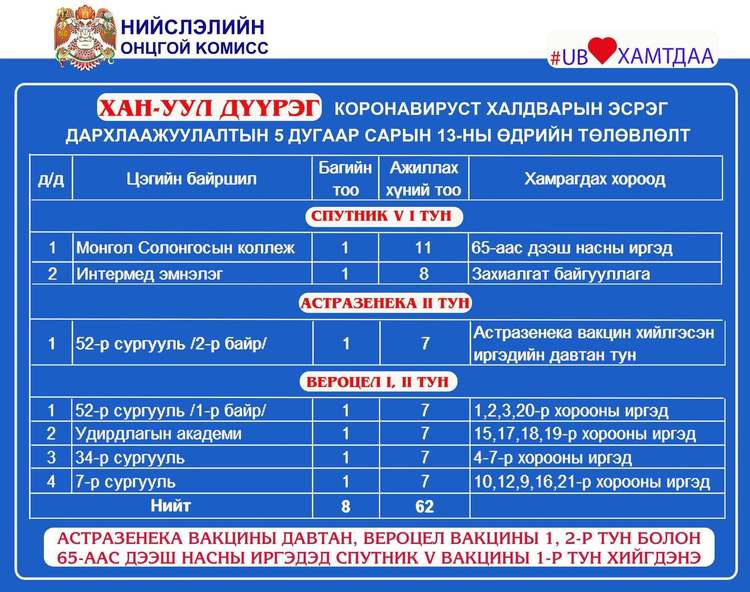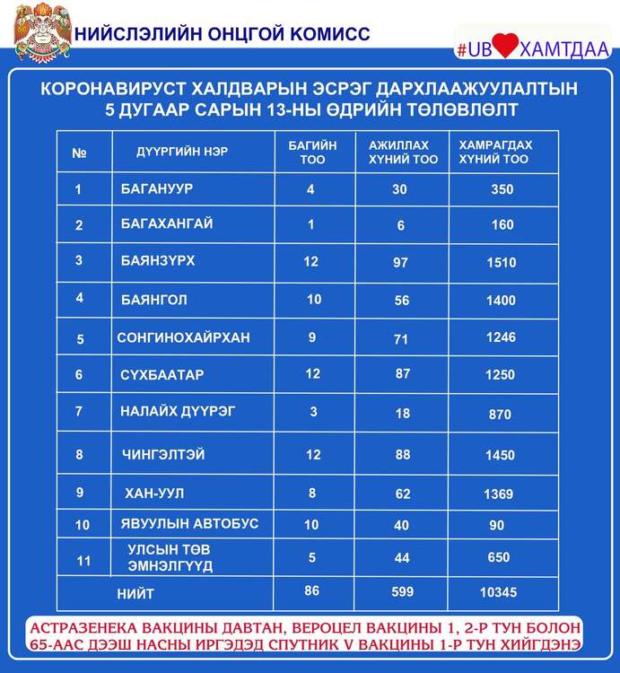 Өнөөдөр ажиллах #дархлаажуулалтын_цэгийг дүүрэг тус бүрээр танилцуулж байна. Улаанбаатар хотод суурин 38 цэгт, явуулын 10 автобусаар 86 багийн 599 эмч, ажилтан ажиллаж, 10345 иргэнийг дархлаажуулахаар төлөвлөлөө.