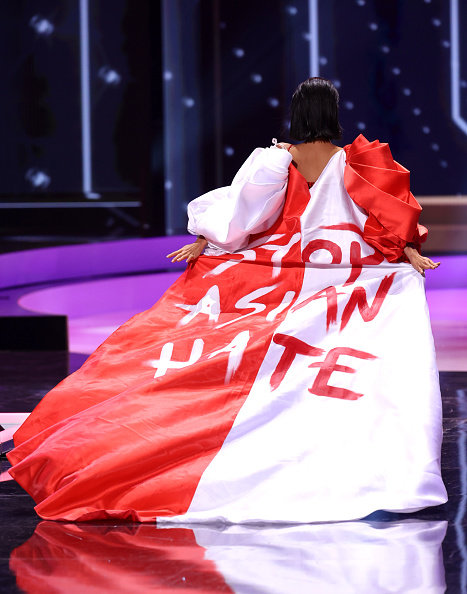 Сингапурын гоо бүсгүй Бернадетт Белль Онг цар тахлын улмаас азиудыг үзэн ядах хандлага АНУ-д даамжирч байгааг эсэргүүцэн "Азиудыг үзэн ядахаа зогсоо" гэсэн бичиг бүхий торгон нөмрөгтэйгээр тайзнаа алхсан байна.
