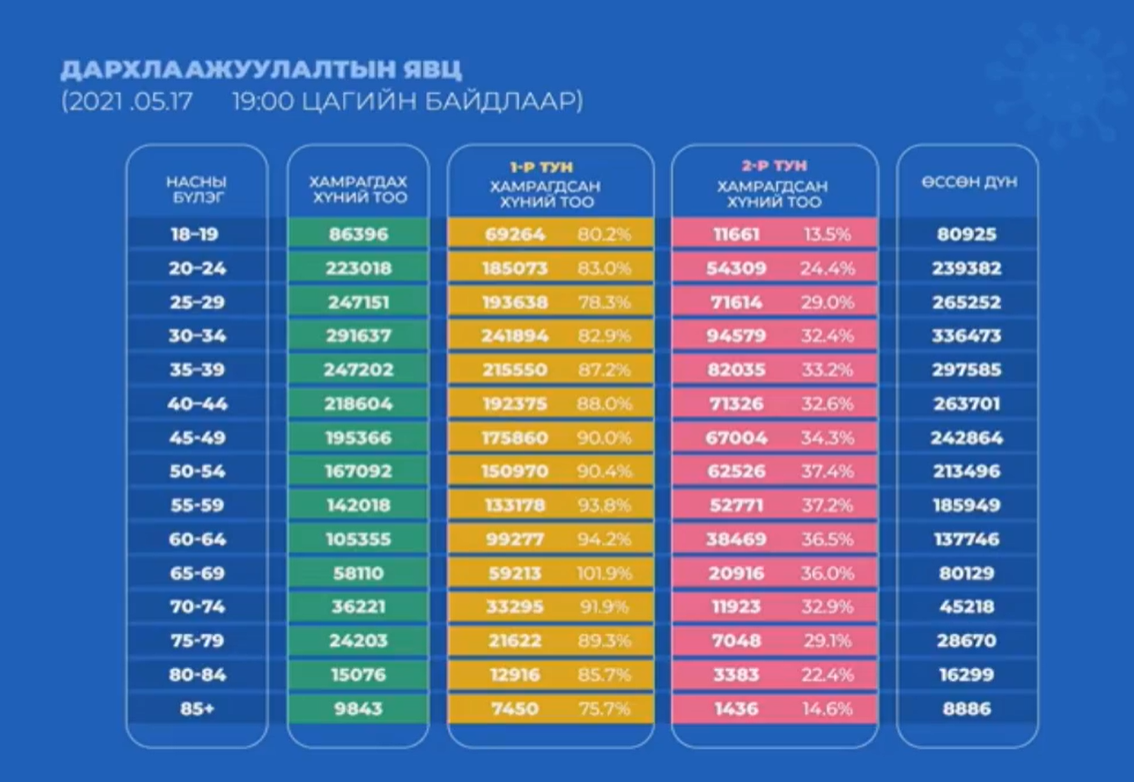 -Сүүлийн 24 цагийн хугацаанд 19 374 хүн дархлаажуулалтад хамрагджээ. Ингэснээр улсын хэмжээнд нийт нэгдүгээр тунд 1 792 657 хүн буюу 86 хувь, хоёрдугаар тунд 651 588 хүн буюу 31 хувь хамрагдсан байна.