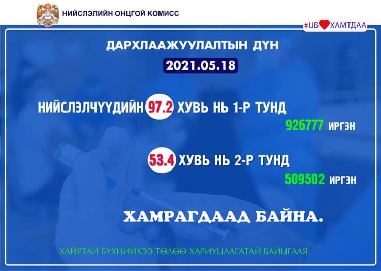 Өчигдөр нийслэлийн хэмжээнд I тунд 1827, II тунд 12248, нийт 14075 иргэнийг дархлаажуулалтад хамруулжээ. Вакцинжуулалт эхэлснээс хойш нийслэлийн 18-аас дээш насны иргэдийн 97.2 хувь буюу 926777 нь I тунд, 53.4 хувь буюу 509502 нь II тунд хамрагдаад байна.