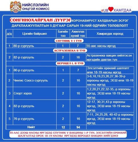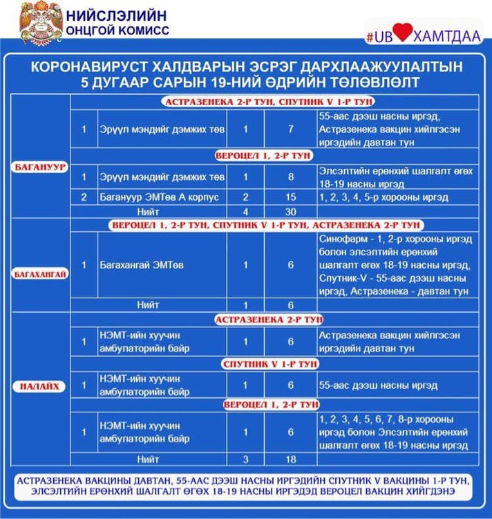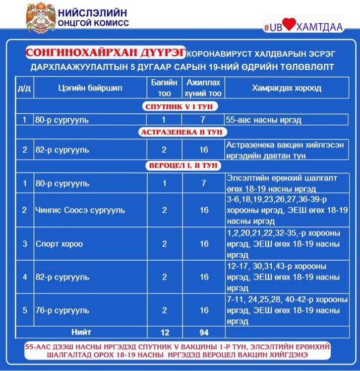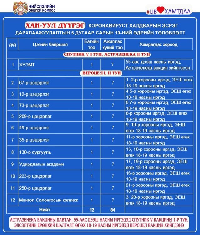 Өнөөдөр Улаанбаатар хотод 51 суурин цэгт, 56 явуулын автобусаар 158 багийн 955 эмч, ажилтан ажиллаж, 36732 иргэнийг дархлаажуулахаар төлөвлөлөө. Элсэлтийн ерөнхий шалгалт өгөх 18-аас дээш насны иргэд вакциндаа идэвхтэй хамрагдаарай. Дархлаажуулалтын цэгүүдийг дүүрэг тус бүрээр танилцуулж байна.