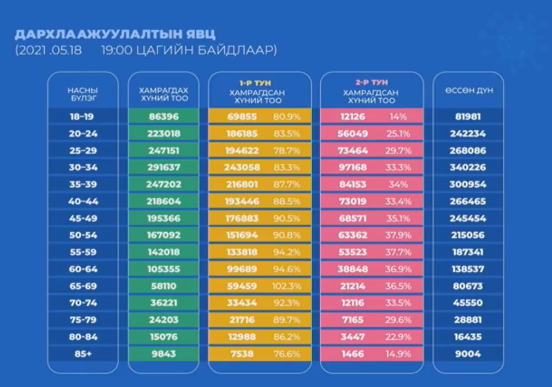 -Сүүлийн 24 цагийн хугацаанд 22 198 хүн дархлаажуулалтад хамрагджээ. Ингэснээр улсын хэмжээнд нийт нэгдүгээр тунд 1 802 270 хүн,, хоёрдугаар тунд 666 287 хүн хамрагдсан байна.