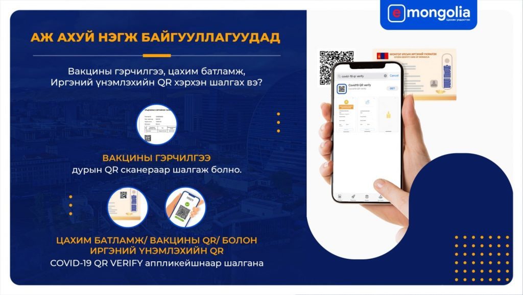 – Харин иргэн иргэний үнэмлэх эсвэл вакцины цахим батламж буюу / вакцины QR / биедээ авч яваа бол COVID 19 QR VERIFY аппликейшныг үйлчилгээний байгууллагын ажилтан гар утсандаа суулгаж, үйлчлүүлэгчээ таньж нэвтрүүлнэ.