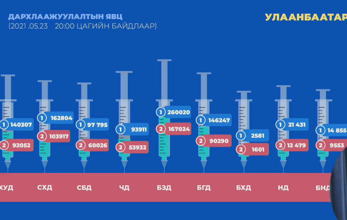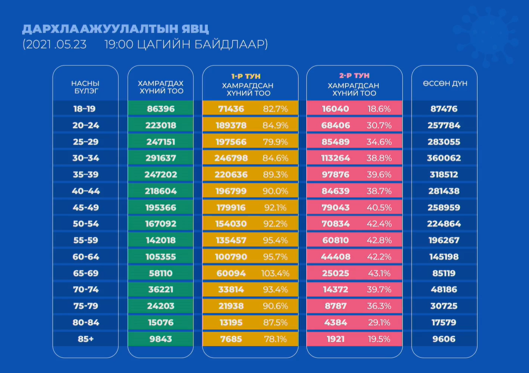 -Сүүлийн 24 цагийн хугацаанд 25 084 хүн дархлаажуулалтад хамрагджээ. Тодруулбал, Улаанбаатар хотын хэмжээнд вакцины нэгдүгээр тунд 939 951 хүн, хоёрдугаар тунд 590 874 хүн нь хоёрдугаар тундаа хамрагджээ. Харин орон нутагт 890 672/79,9/ хүн нэгдүгээр тунд, 185 066 хүн хоёрдугаар тунд хамрагдсан байна. Ингэснээр улсын хэмжээнд нийт нэгдүгээр тунд 1 830 623 хүн, хоёрдугаар тунд 775 940 хүн хамрагджээ.