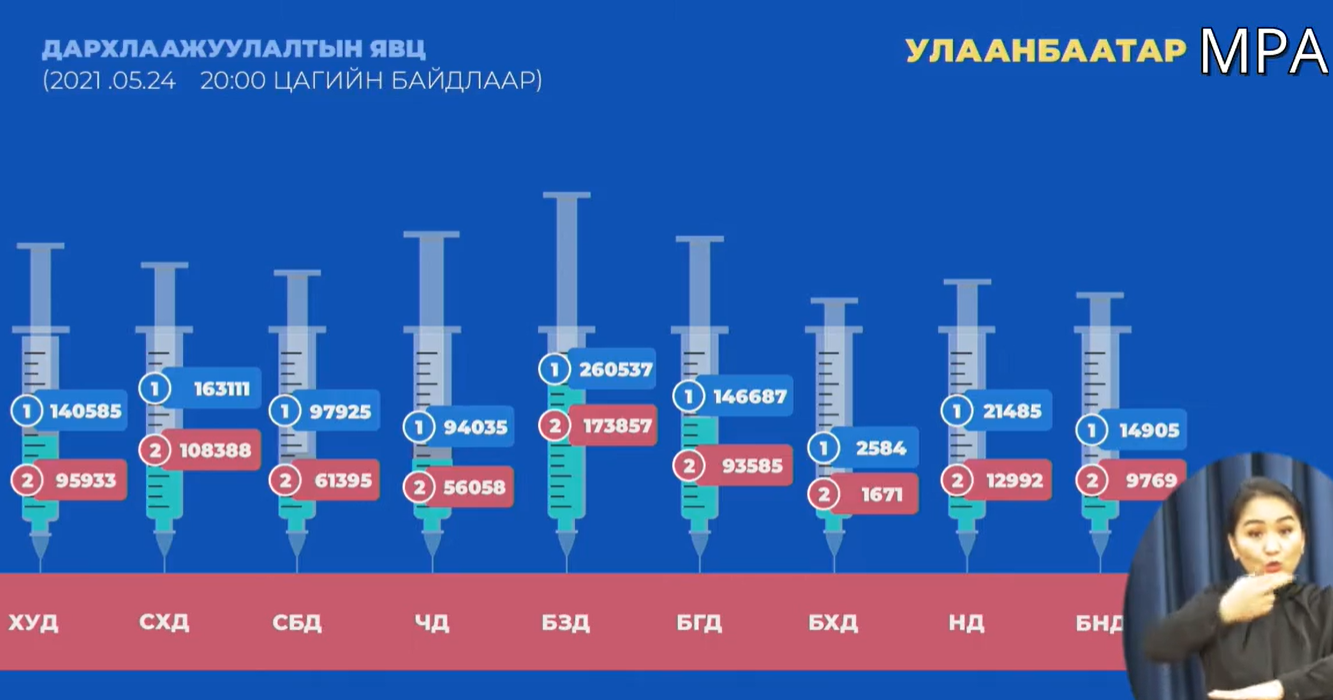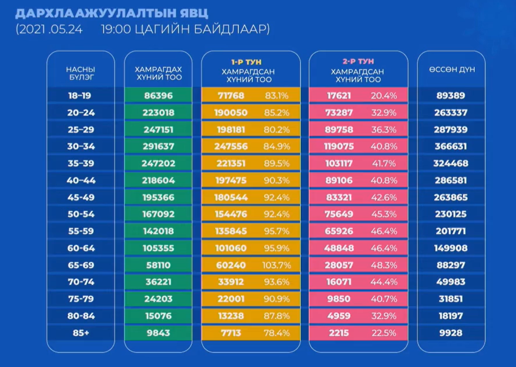 -Сүүлийн 24 цагийн хугацаанд 55 403 хүн дархлаажуулалтад хамрагджээ. Ингэснээр улсын хэмжээнд нийт нэгдүгээр тунд 1 836 501 хүн, хоёрдугаар тунд 827 513 хүн хамрагджээ.