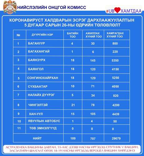 Өнөөдөр /2021.05.26/ нийтийн амралтын өдөр хэдий ч дархлаажуулалтын цэгүүд 09:00-17:00, PCR шинжилгээний зургаан цэг 09:00-12:00 цагийн хооронд нийслэлийн төвийн зургаан дүүрэгт суурин 3, явуулын 3 шинжилгээний цэг ажиллана.