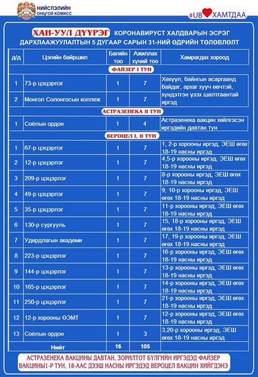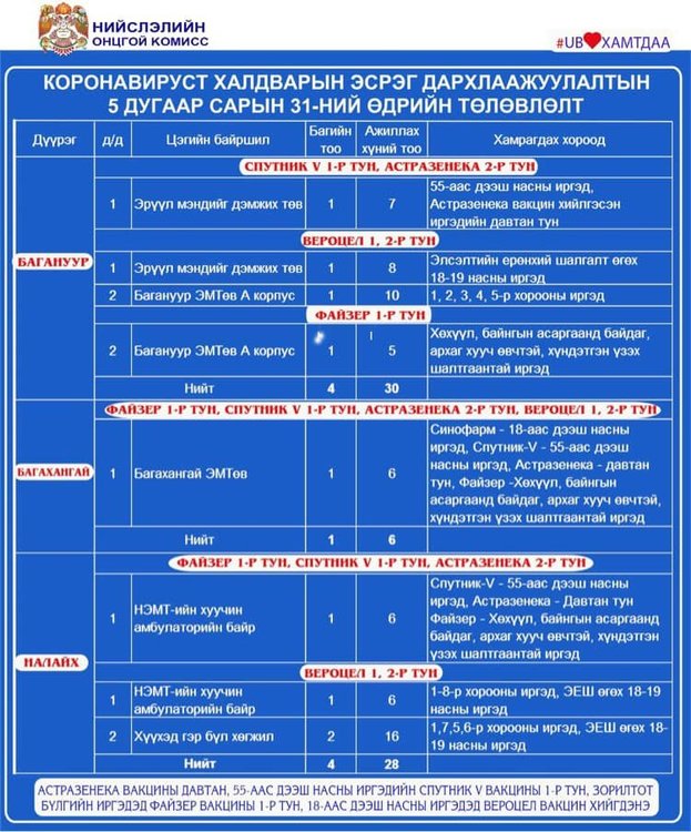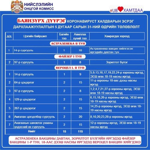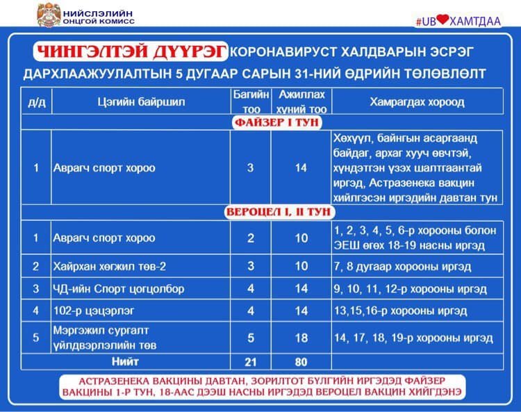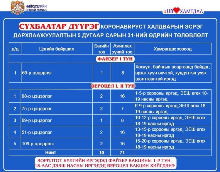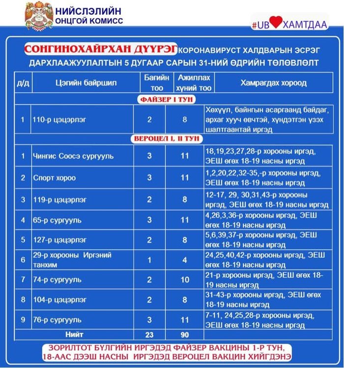 Өнөөдөр Улаанбаатар хотод явуулын 2, суурин 54 цэгт 111 багийн 640 эмч, ажилтан ажиллаж, 14425 иргэнийг дархлаажуулна. Дархлаажуулалтын цэгийг дүүрэг тус бүрээр танилцуулж байна.