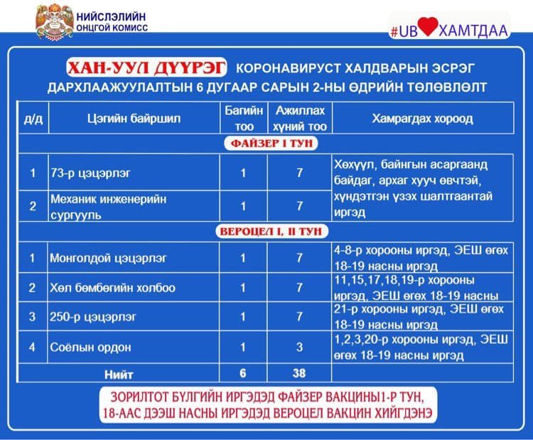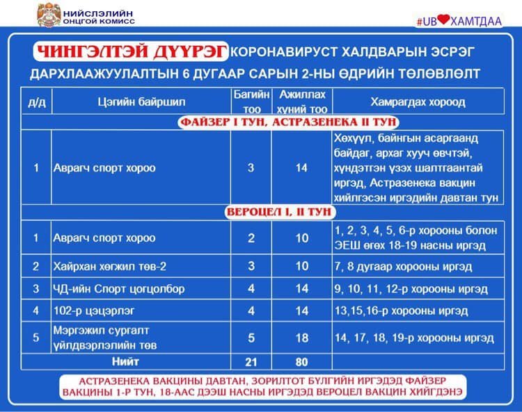 Өнөөдөр Улаанбаатар хотод явуулын 2, суурин 44 цэгт 97 багийн 546 эмч, ажилтан ажиллаж, 13885 иргэнийг дархлаажуулахаар төлөвлөжээ. Дархлаажуулалтын цэгүүдийг дүүрэг тус бүрээр танилцуулж байна.