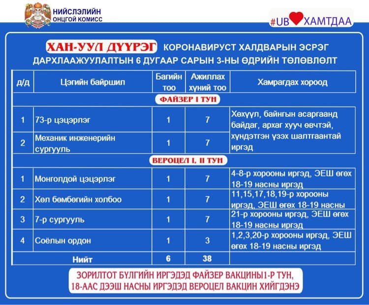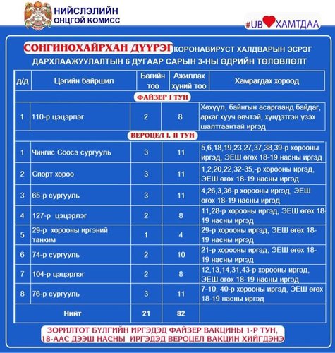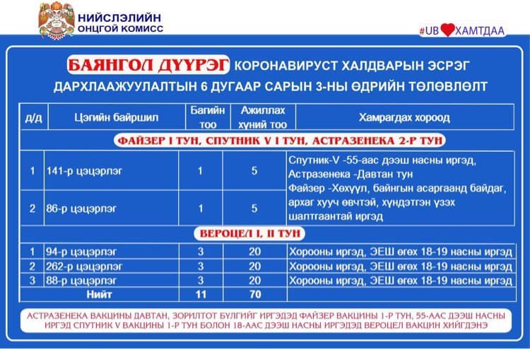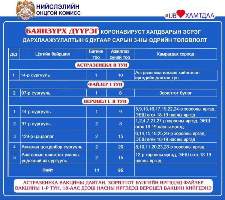 Өнөөдөр Улаанбаатар хотод явуулын 5, суурин 42 цэгт 98 багийн 541 эмч, ажилтан ажиллаж, 13.885 иргэнийг дархлаажуулахаар төлөвлөлөө. Дархлаажуулалтын цэгүүдийг дүүрэг бүрээр танилцуулж байна.