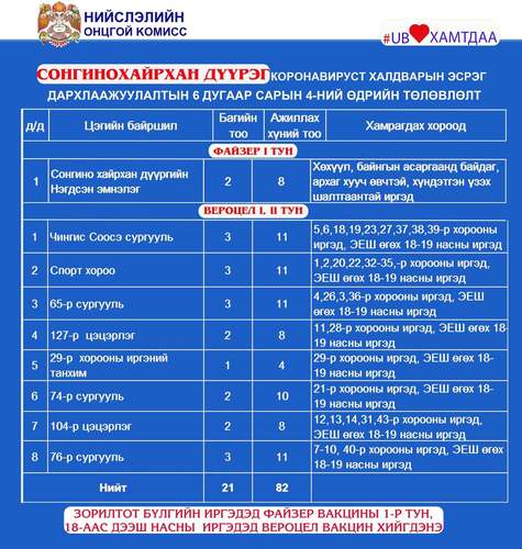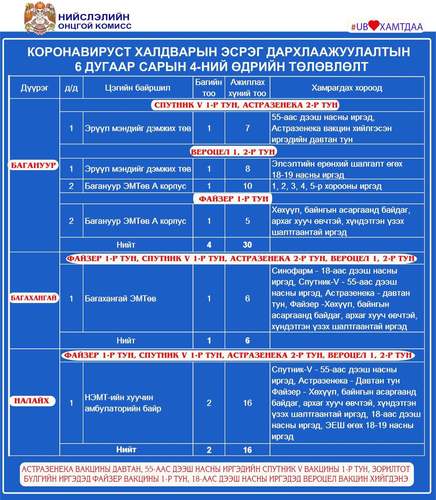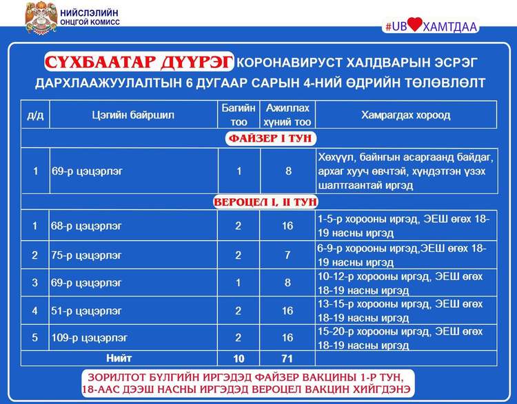 Өнөөдөр Улаанбаатар хотод явуулын 4, суурин 41 цэгт 95 багийн 520 эмч, ажилтан ажиллаж, 10260 иргэнийг дархлаажуулахаар төлөвлөсөн байна. Дархлаажуулалтын цэгүүдийг дүүрэг бүрээр танилцуулж байна.
