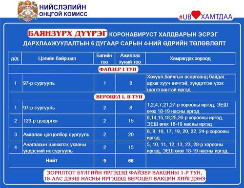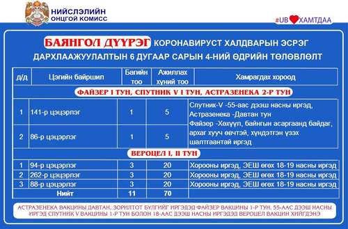 Энэ сарын гурванд нийслэлийн хэмжээнд I тунд 1128, II тунд 15312, нийт 16440 иргэнийг дархлаажуулалтад хамруулжээ. Вакцинжуулалт эхэлснээс хойш нийслэлийн 18-аас дээш насны иргэд 100 хувь буюу 953.764 нь I тунд, 81.5 хувь буюу 776.787 нь II тунд хамрагдаад байгаа юм.