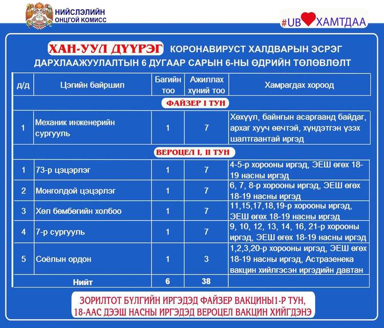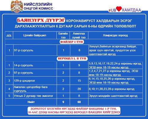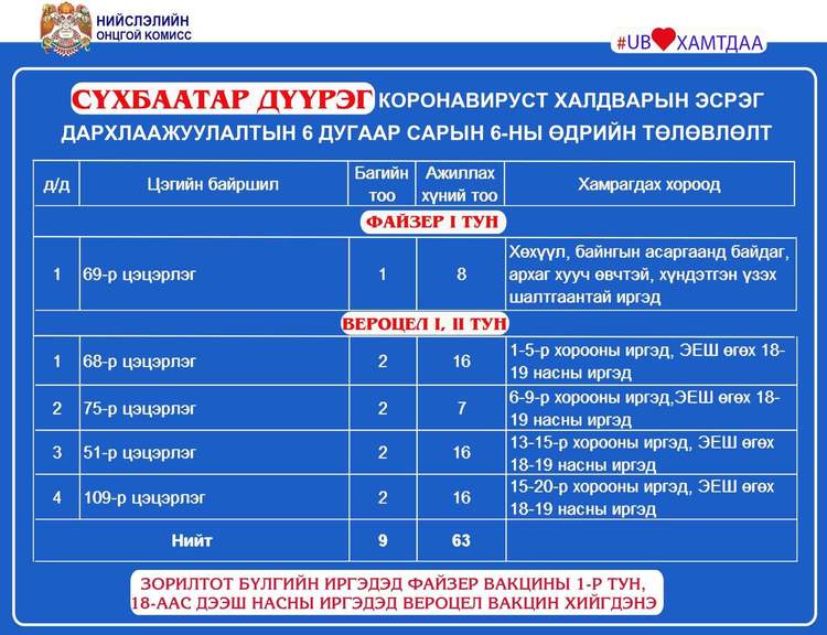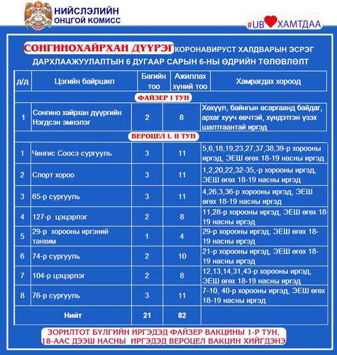 Өнөөдөр Улаанбаатар хотод явуулын 4, суурин 39 цэгт 88 багийн 469 эмч, ажилтан ажиллаж, 7548 иргэнийг дархлаажуулахаар төлөвлөлөө. дархлаажуулалтын цэгүүдийг дүүрэг бүрээр танилцуулж байна.