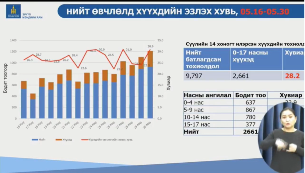 Сүүлийн 14 хоногийн хугацаанд хүүхдийн өвчлөл нэмэгдсэн. Халдварт өртсөн таван хүн тутмын нэг нь хүүхэд байгаа. Тиймээс хүүхдийн амны хаалтаа сайн зүүх хэрэгтэй. Хүүхдийг хөхөөр хооллож, хараа хяналтаа сайжруулах шаардлагатай.