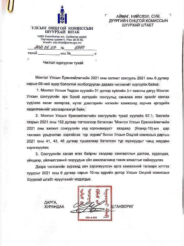 Улсын онцгой комиссоос нийслэл, аймаг, сум, дүүргийн сонгуулийн байгууллагад чиглэл өглөө. Ингэхдээ маргааш буюу сонгуулийн санал хураалтын өдөр иргэдийн сонгох эрхийг хангах үүднээс хөдөлгөөнийг хязгаарлахгүй байхыг үүрэгджээ.