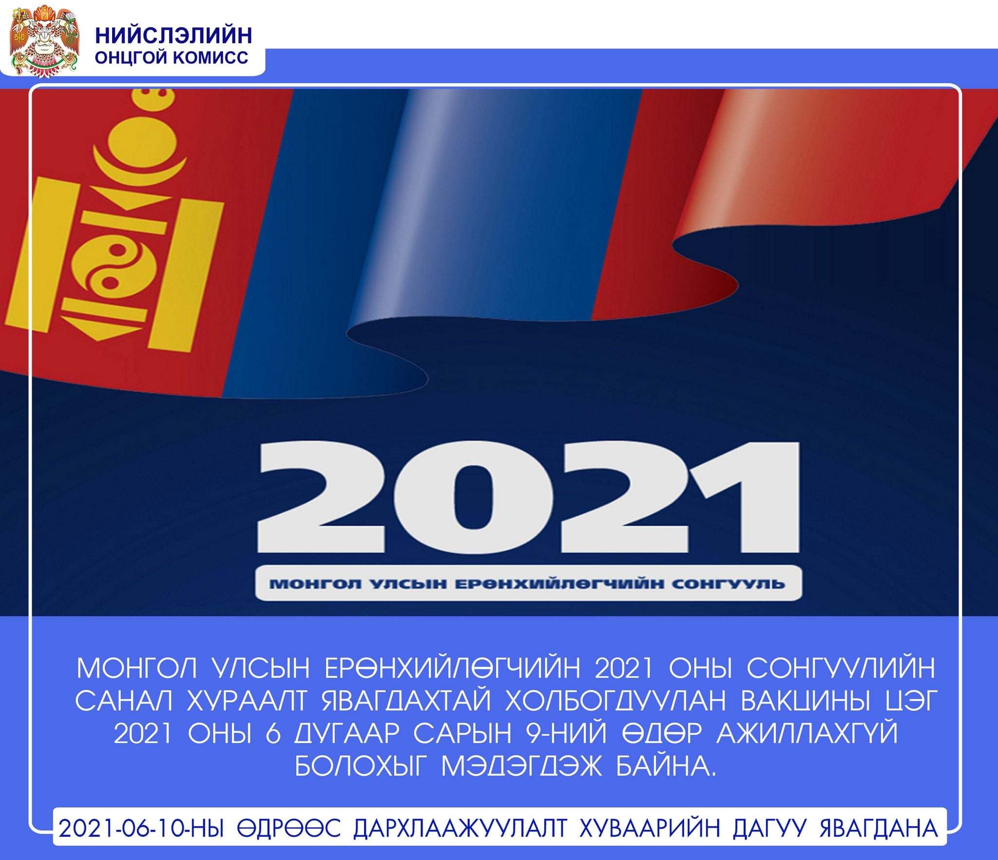 Монгол Улсын Ерөнхийлөгчийн ээлжит сонгуулийн санал хураалт маргааш болно. Иймд маргааш дархлаажуулалтын цэгүүд ажиллахгүй. Харин энэ сарын 10-наас хэвийн ажиллаж эхэлнэ.