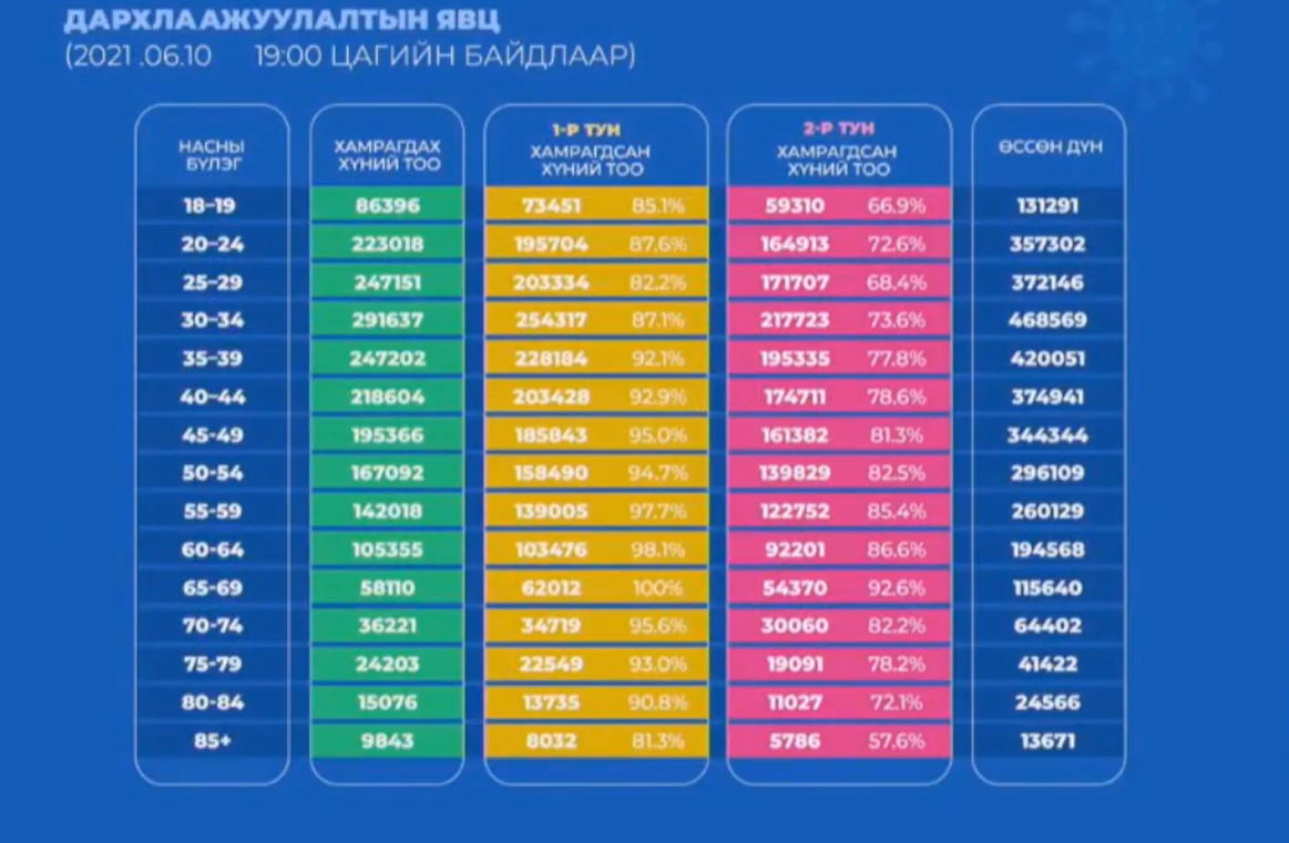 -Сүүлийн 24 цагийн хугацаанд 19 512 хүн дархлаажуулалтад хамрагджээ. Ингэснээр улсын хэмжээнд нийт нэгдүгээр тунд 1 887 425 /91,3%/ хүн, хоёрдугаар тунд 1 621 046 /78,4%/ хүн хамрагджээ.