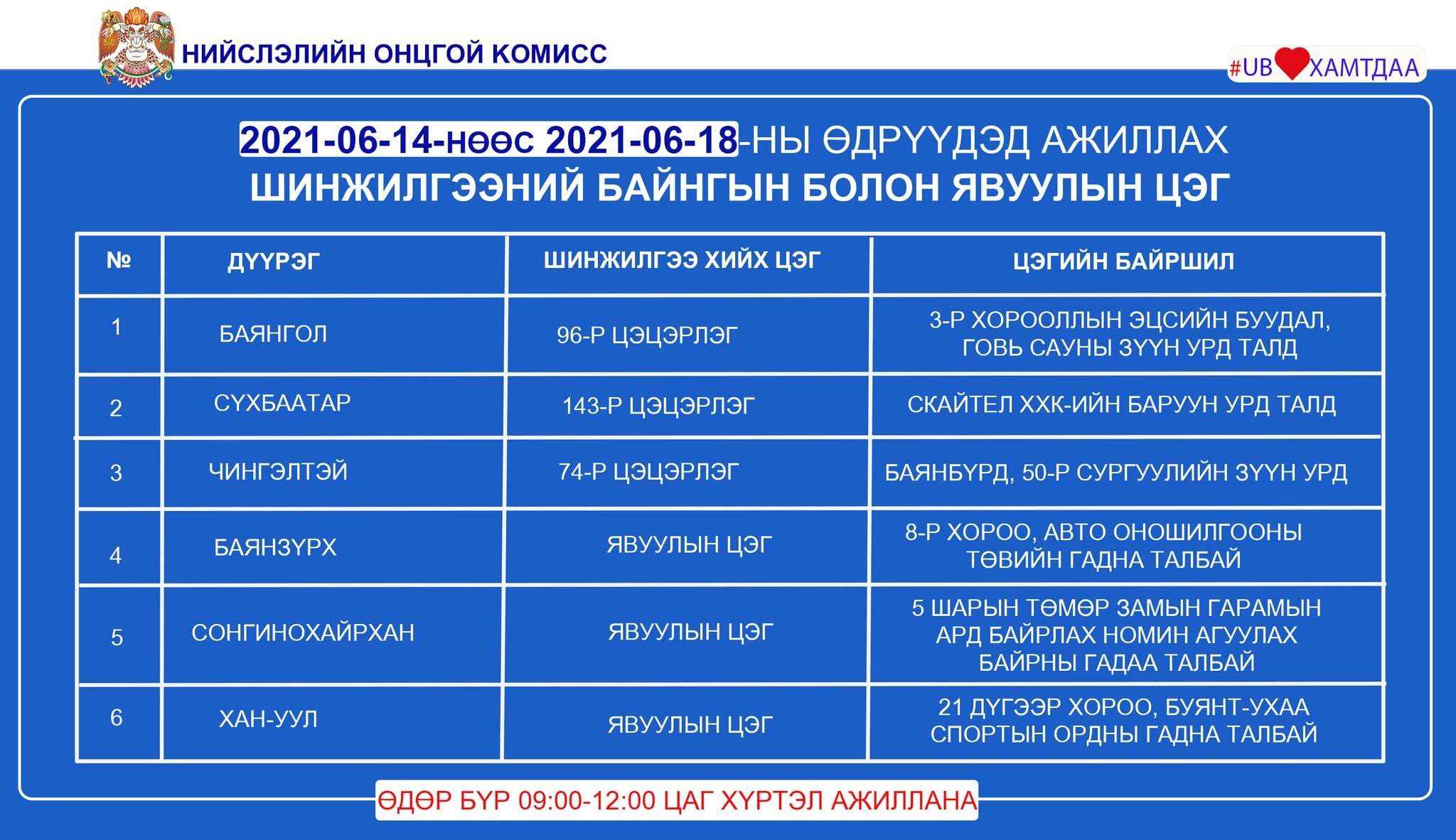 Өчигдөр нийслэлийн хэмжээнд I тунд 154, II тунд 1280, нийт 1434 иргэнийг дархлаажуулалтад хамруулжээ. Вакцинжуулалт эхэлснээс хойш нийслэлийн 18-аас дээш насны иргэдийн 100.8 хувь буюу 961.247 нь I тунд, 87.8 хувь буюу 837.191 нь II тунд хамрагдаад байгаа. Тэгвэл өнөөдрөөс буюу 2021.06.14-2021.06.18-ны хооронд ажиллах шинжилгээний цэгийн байршлыг танилцуулж байна.