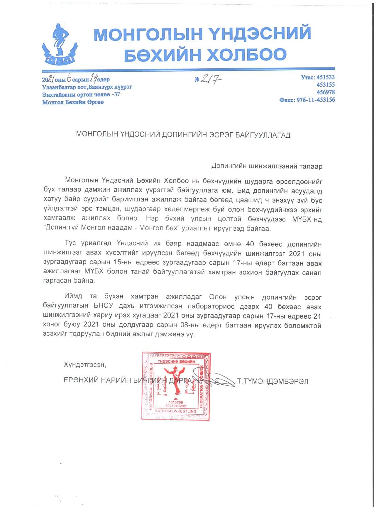 Монголын Үндэсний Бөхийн Холбооноос допингийн эсрэг байгууллагад хандлаа. Ингэхдээ наадмаас өмнө 40 бөхөөс допингийн шинжилгээ авахыг хүслээ. Учир нь нэр бүхий улсын цолтой бөхчүүдээс МҮБХ-нд “Допинггүй Монгол наадам - Монгол бөх” уриалгыг ирүүлж, шинжилгээг 2021 оны зургадугаар сарын 15-17-ны өдөрт багтаан авахыг хүсчээ. Энэ дагуу МҮБХ допингийн эсрэг байгууллагад хандлаа.