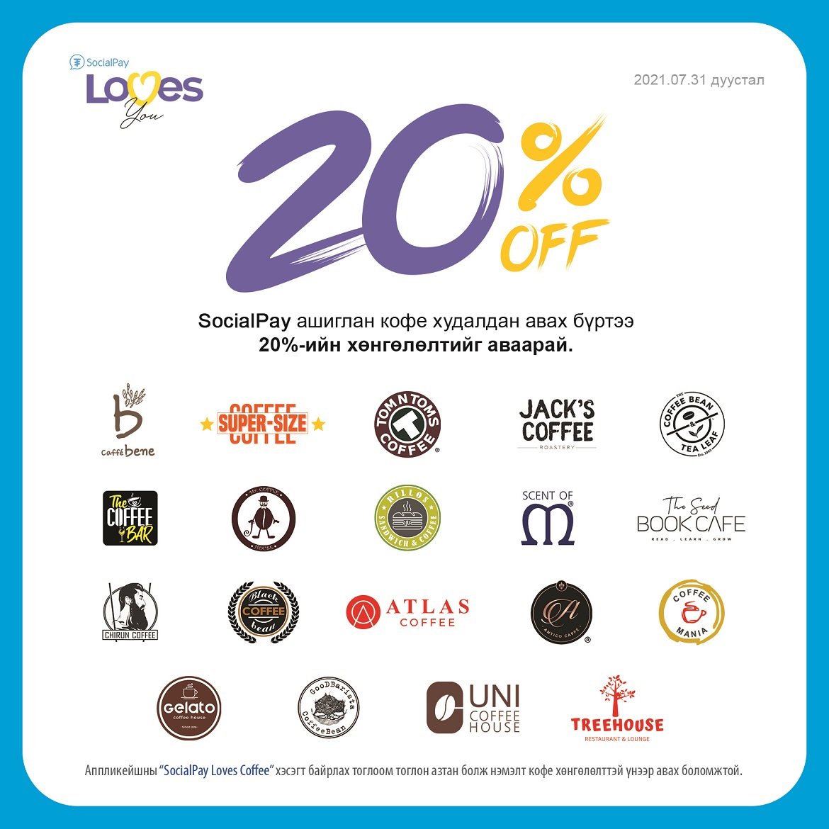 Та энэхүү аяны хугацаанд Улаанбаатар хотод байрлах нэр бүхий 19 кофе шоп болон тэдгээрийн нийт 50 гаруй салбараар үйлчлүүлэн өөрийн дуртай кофегоо SocialPay аппликэйшн ашиглан худалдан авах бүртээ 20%-ийн хөнгөлөлтийг авах юм.