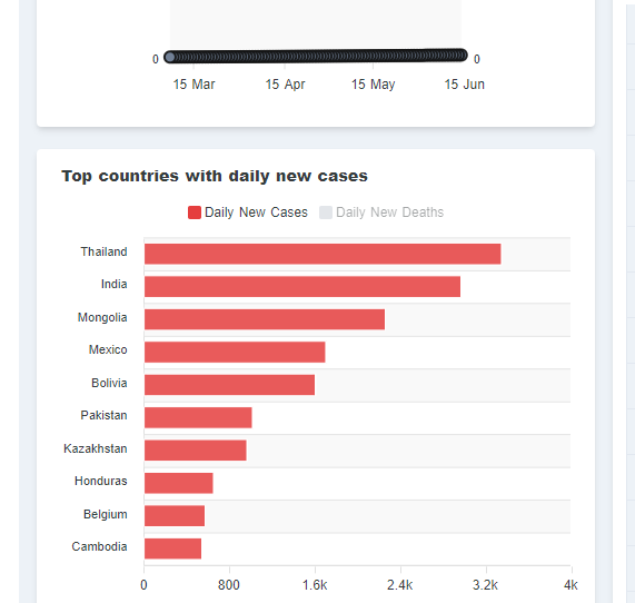 Энэ үзүүлэлтээрээ буюу өдөрт илрэх тохиолдлын тоогоор Монгол Улс coronatracker цахим хуудас дээрх "Өдөрт илрэх шинэ тохиолдлын тоогоор эхний 10 орон" жагсаалтад Тайланд, Энэтхэгийн араас гуравдугаарт бичигджээ.