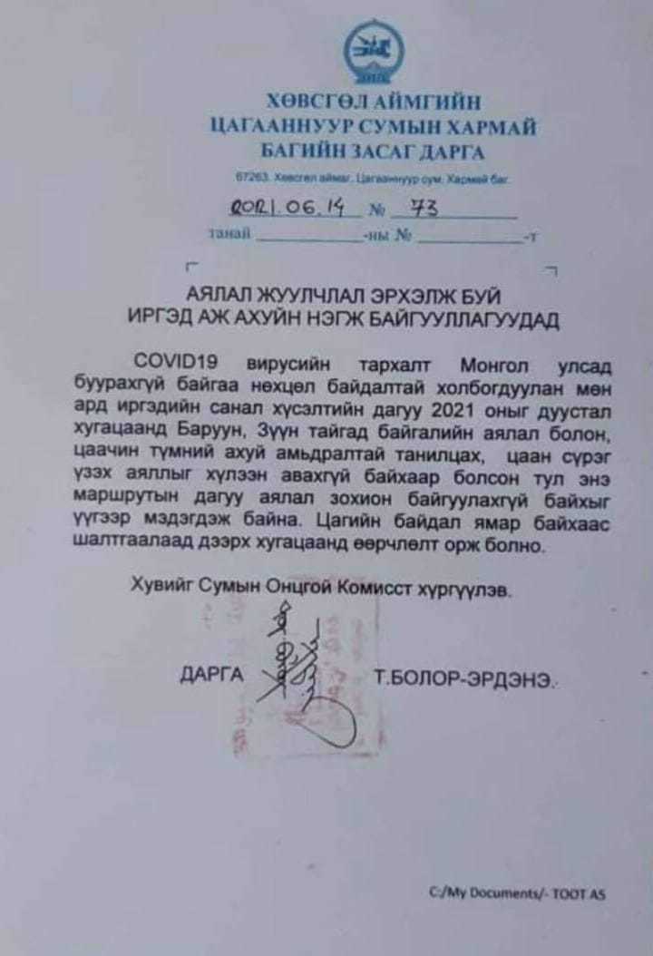 Манай улсад коронавирусийн нөхцөл байдал улам хүндэрч, шинээр батлагдах тохиолдлын тоо нэмэгдсээр байна. Мөн нас баралт буурахгүй буй. Үүнээс үүдэн Хөвсгөл аймгийн Цагааннуур сумын Засаг дарга Хармай багийн Засаг дарга Т.Болор-Эрдэнэ шийдвэр гаргажээ. Ингэхдээ 2021 оныг дуустал Баруун, зүүн тайгад аялагч, жуулчдыг хүлээн авахгүйгээ мэдэгдэв.