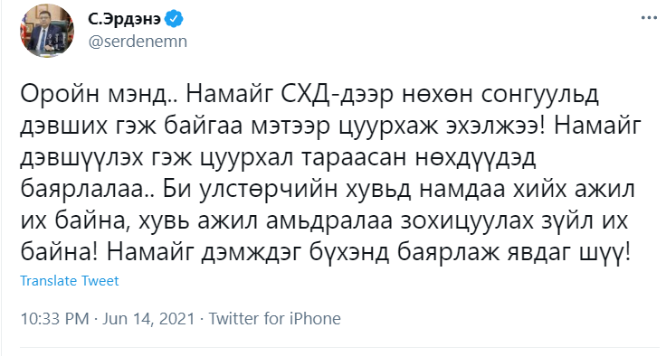 С. ЭРДЭНИЙГ ЯАЖ ДАРГА БОЛГОСОН ТЭР ЖУРМААРАА ХУРАЛДАЖЖ 3 Н СОНГУУЛЬД НАМАА САНААТАЙГААР ЯЛАГДУУЛСАНД ХАТУУ ХАРИУЦЛАГА ХҮЛЭЭЛГЭЖ НАМААСАА ХӨӨХ ХЭРЭГТЭЙ ӨӨРӨӨР ЯАХ ЁСТОЙ ЮМ .ҮНЭХЭЭР ҮНЛЭСНИЙ ХЭМЖЭЭНИЙ НАМ ЮМ БОЛ ЗАНГАРАГАА ХАРУУЛААЧ