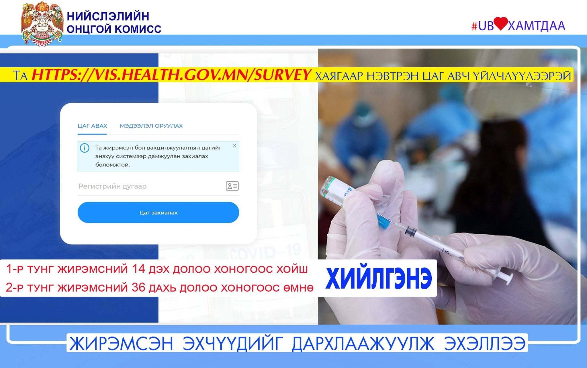 Дархлаажуулалтыг сайн дурын үндсэн дээр хийх бөгөөд вакцинд хамрагдахыг хүсвэл http://vis.health.gov.mn.survey хаягаар нэвтэрч, цаг авч үйлчлүүлнэ. Энэ нь жирэмсэн эхчүүдэд аль болох хүндрэл учруулахгүй үйлчлэх зорилготой юм.