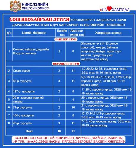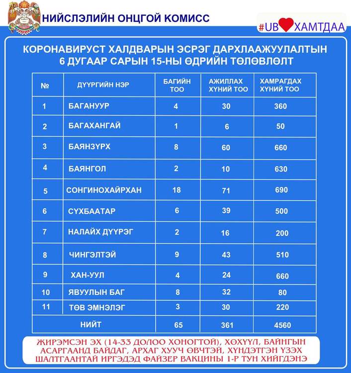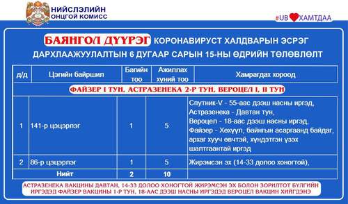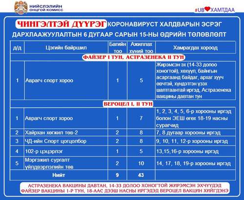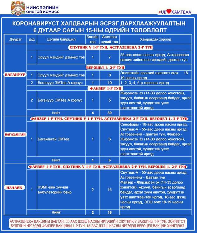 Өчигдөр нийслэлийн хэмжээнд I тунд 802, II тунд 3692, нийт 4494 иргэнийг дархлаажуулалтад хамруулжээ. Вакцинжуулалт эхэлснээс хойш нийслэлийн 18-аас дээш насны иргэдийн 100.9 хувь буюу 962.328 нь I тунд, 88.2 хувь буюу 841.548 нь II тунд хамрагдаад байна. Өнөөдөр Улаанбаатар хотод явуулын 8, суурин 35 цэгт 65 багийн 361 эмч, ажилтан ажиллаж, 4560 иргэнийг дархлаажуулна. Дархлаажуулалтын цэгүүдийн мэдээллийг дүүрэг тус бүрээр нь танилцуулж байна.