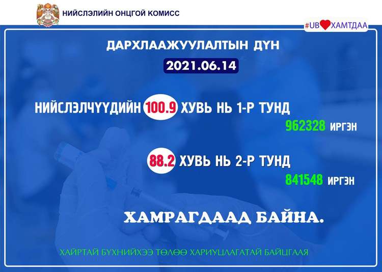 Өчигдөр нийслэлийн хэмжээнд I тунд 802, II тунд 3692, нийт 4494 иргэнийг дархлаажуулалтад хамрууллаа. Вакцинжуулалт эхэлснээс хойш нийслэлийн 18-аас дээш насны иргэдийн 100.9 хувь буюу 962.328 нь I тунд, 88.2 хувь буюу 841.548 нь II тунд хамрагдаад байна.