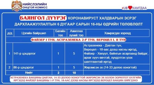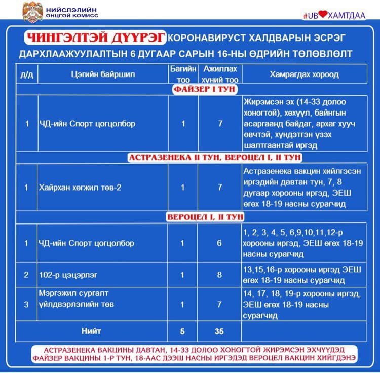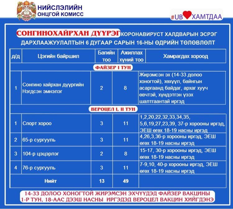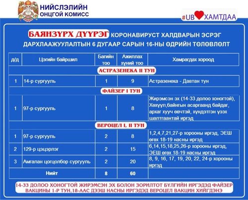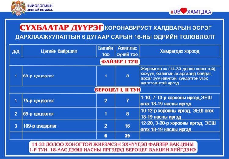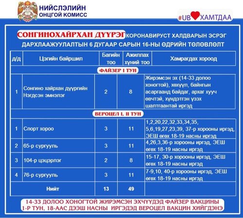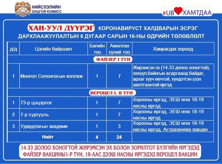 Мөн өнөөдөр /2021.06.16/ Улаанбаатар хотод явуулын 8, суурин 30 цэгт 55 багийн 321 эмч, ажилтан ажиллаж, 4235 иргэнийг дархлаажуулахаар төлөвлөжээ. Дархлаажуулалтын цэгүүдийг дүүрэг тус бүрээр танилцуулж байна.