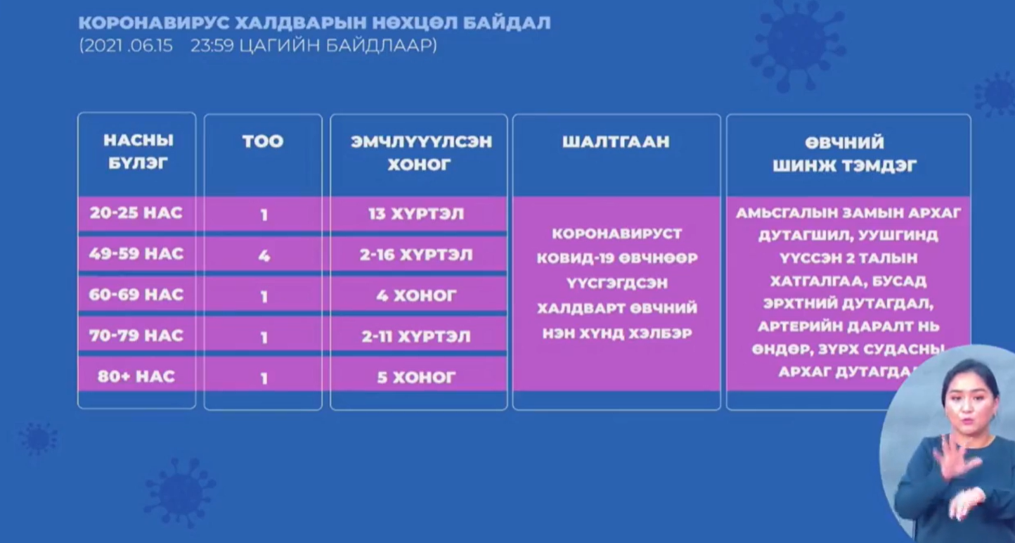 -Сүүлийн 24 цагийн хугацаанд халдварын улмаас 9 хүн нас барлаа. Ингэснээр халдварын улмаас нийт нас барсан хүний тоо 389 болж байна. Тодруулбал, сүүлийн 24 цагийн хугацаанд нас барсан 22 настай иргэн нь вакцинд хамрагдаагүй байсан аж. Нас барсан хүмүүсийг насны бүлгээр нь танилцуулбал,