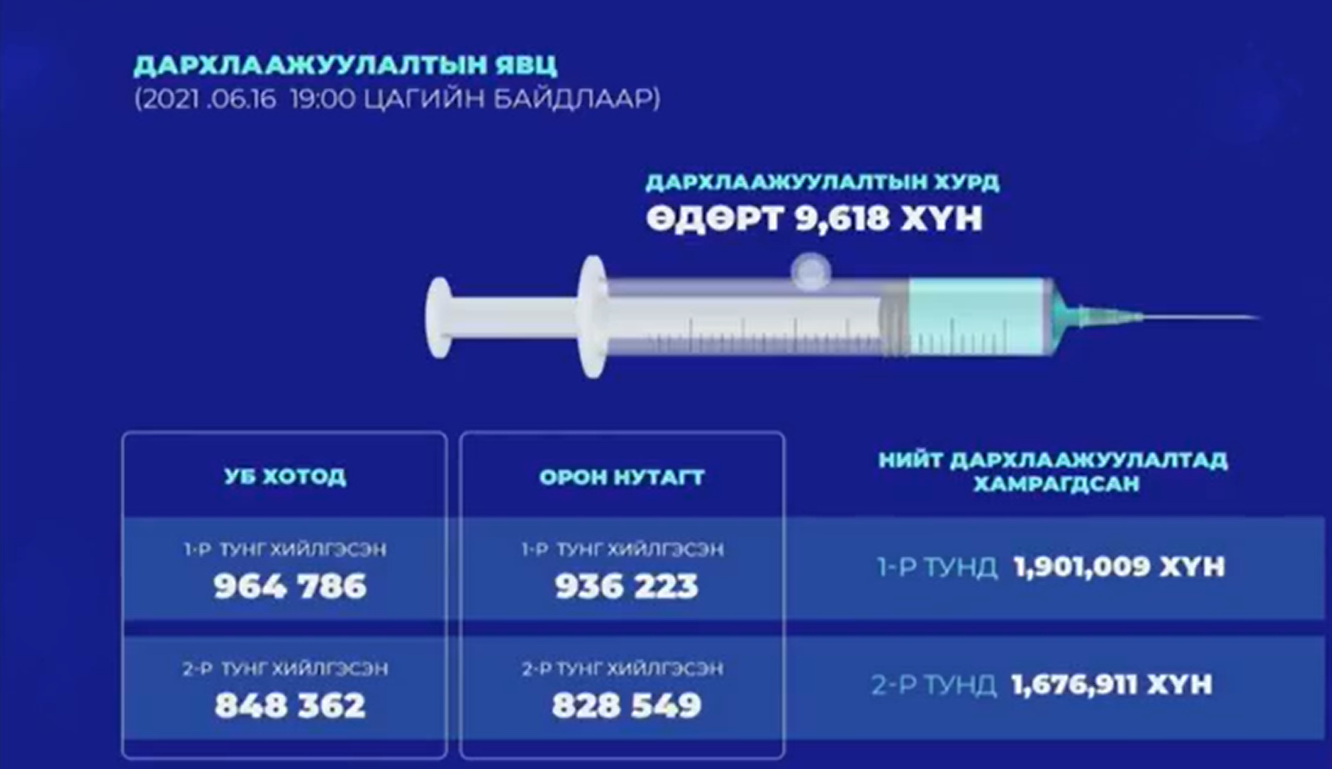 -Сүүлийн 24 цагийн хугацаанд 9618 хүн дархлаажуулалтад хамрагджээ. Тухайлбал, 4,446 нь Улаанбаатар хотод, 5,572 хүн орон нутагт хамрагдсан байна. Ингэснээр улсын хэмжээнд нийт нэгдүгээр тунд 1 901 009 хүн, хоёрдугаар тунд 1 676 911 хүн хамрагджээ.