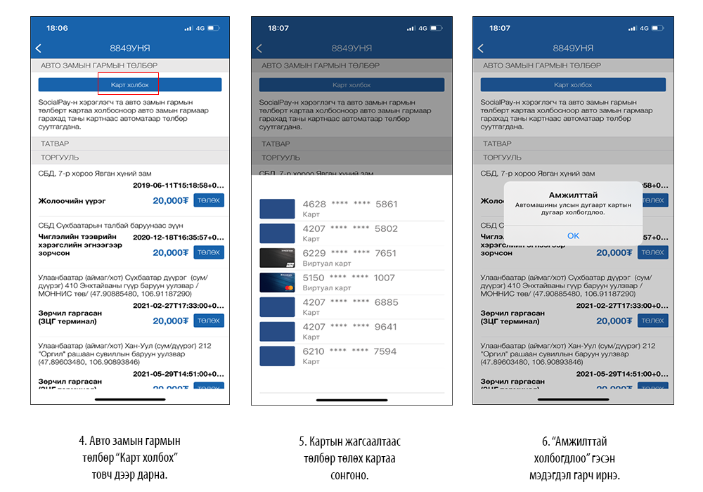 SocialPay аппликэйшнд дурын банкны картаа холбож “Авто замын татвар, торгууль, гарам” цэсэнд машины дугаар болон картаа сонгон бүртгүүлснээр төлбөрөө онлайнаар төлөх боломжтой болно. Ингэснээр олон улсын болон улсын чанартай авто гармаар гарах үед таны картнаас төлбөр автоматаар суутгагдах юм.