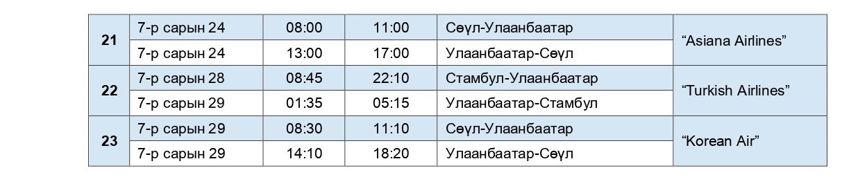 Тасалбар борлуулалт болон нислэг төлөвлөлтийн арга хэмжээ хэвийн горимд шилжиж байгаа тул батлагдсан нислэгийн хуваарийн дагуу тасалбар худалдан авах иргэд агаарын тээвэрлэгчдэд шууд хандана уу.