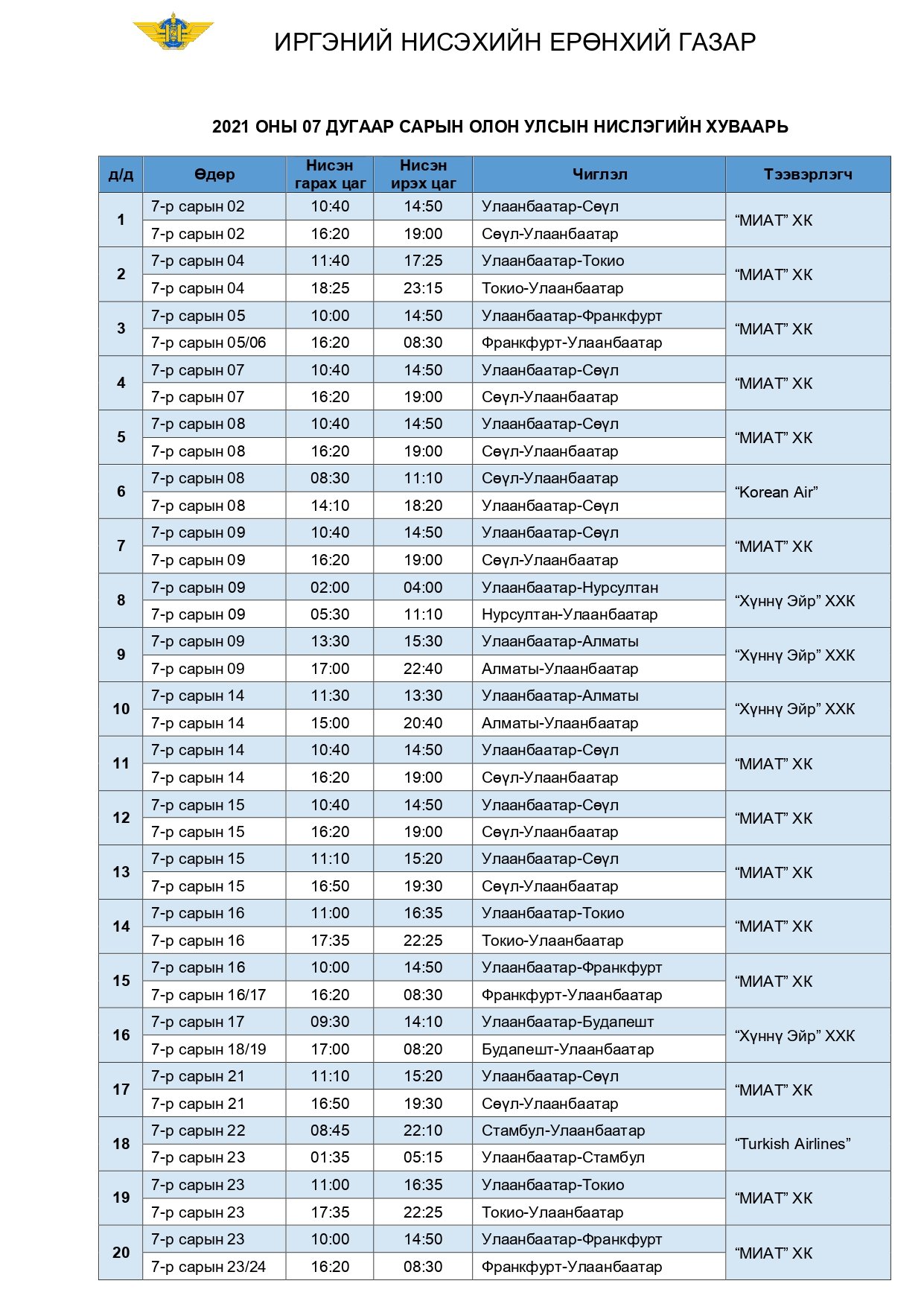 Иргэний нисэхийн Ерөнхий газраас /ИНЕГ/ долдугаар сарын нислэгийн хуваарийг танилцууллаа. Ирэх сард нийт 23 удаагийн нислэгийг Өмнөд Солонгос, Япон, Унгар, Турк, Герман, Казахстан улс руу хийхээр төлөвлөсөн байна.