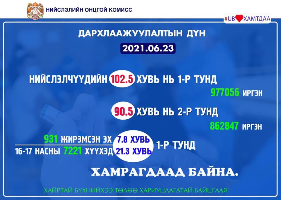 Нийслэлийн хэмжээнд өчигдөр 1 дүгээр тунд 1731, 2 дугаар тунд 1959, нийт 3659 иргэнийг дархлаажуулалтад хамруулжээ. Вакцинжуулалт эхэлснээс хойш нийслэлийн 18-аас дээш насны иргэдийн 102.5 хувь буюу 977056 нь I тунд, 90.5 хувь буюу 862847 нь II тунд хамрагдаад байна. Мөн нийт 931 (7.8 хувь) жирэмсэн эх, 16-17 насны 7221 (21.3 хувь) хүүхэд тус тус дархлаажуулалтад хамрагдаж, вакцины I тунг хийлгээд байна.