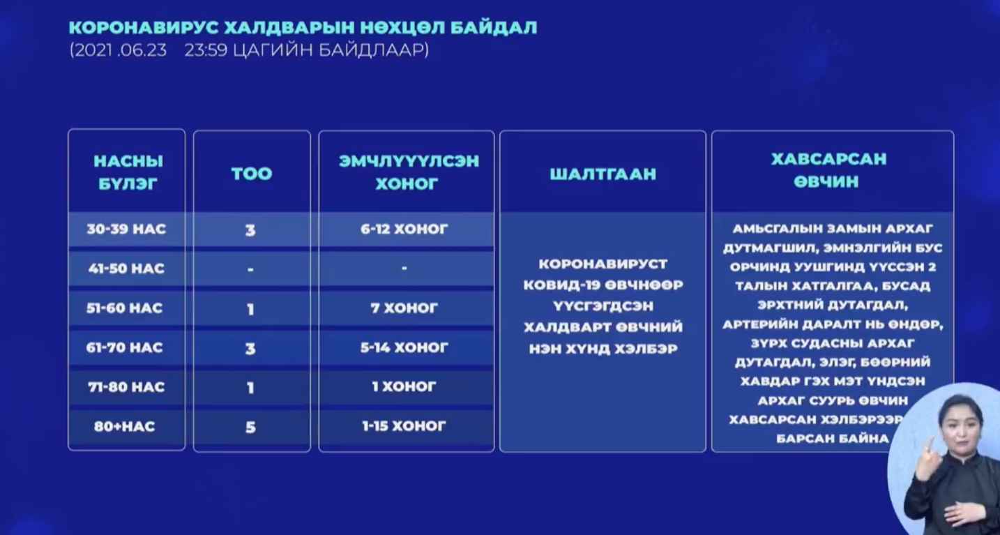 -Сүүлийн 24 цагийн хугацаанд халдварын улмаас 13 хүн нас барлаа. Ингэснээр халдварын улмаас нийт нас барсан хүний тоо 482 болж байна. Нас барсан хүмүүсийг насны бүлгээр нь танилцуулбал,