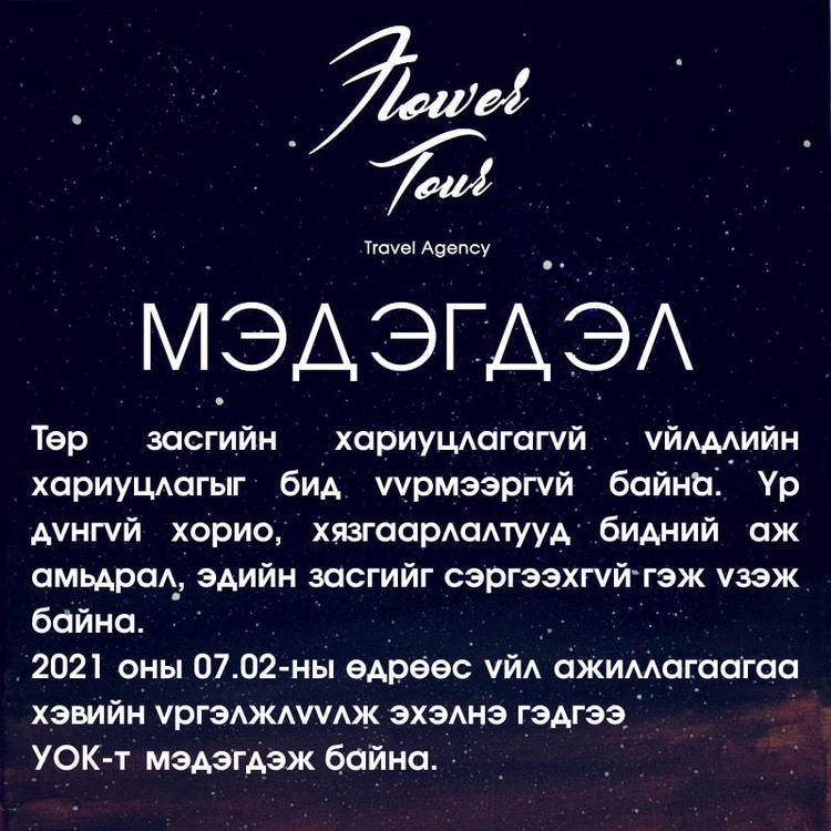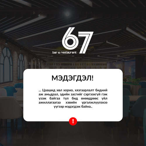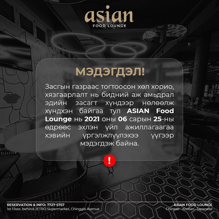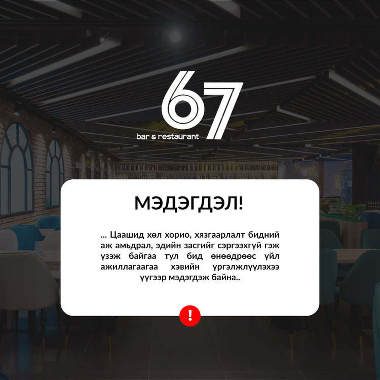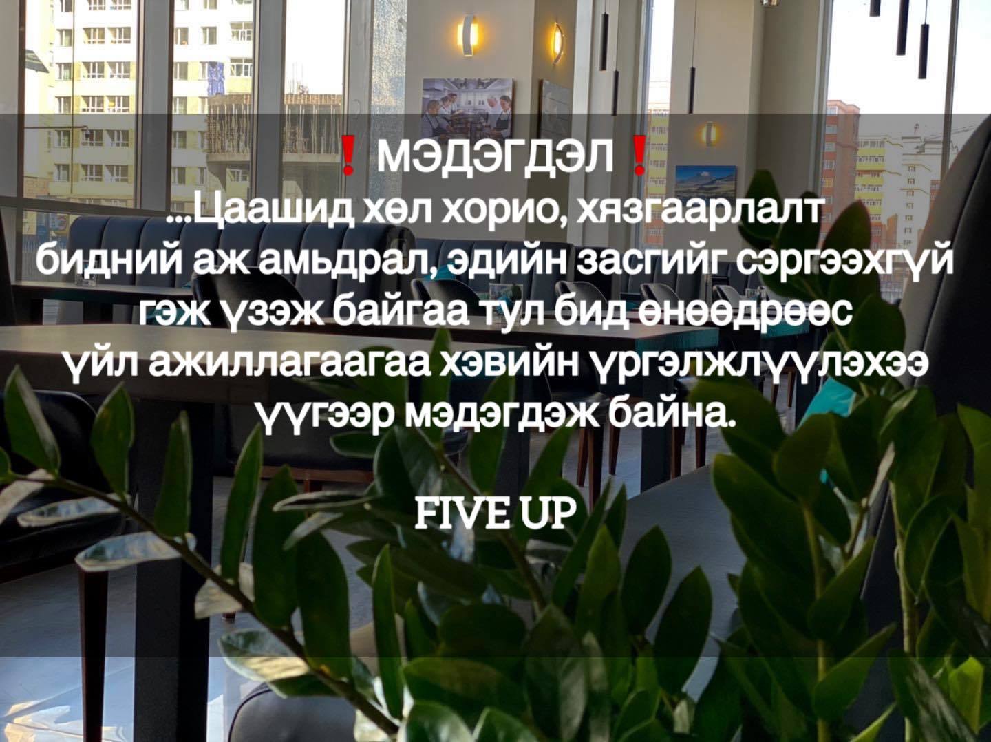 Тиймээс төр засгийн хариуцлагагүй үйлдлийн хариуцлагыг бид үүрмээргүй байна. Үр дүнгүй хорио, хязгаарлалтууд бидний аж амьдрал, эдийн засгийг сэргээхгүй гэж үзэж байна. Тиймээс өнөөдрөөс үйл ажиллагаагаа хэвийн үргэлжлүүлж заалаар үйлчилж эхэлнэ гэдгээ УОК-т үүгээр мэдэгдэж байна.Халдвар хамгааллын дэглэмээ чандлан мөрдөж ажиллах болно. Үйлчлүүлэгчдийнхээ ухамсарт ч бүрэн итгэж байна. Хамтдаа, ухамсартайгаар халдвар хамгааллын дэглэмээ барьж, ковидтой тэмцэж, эдийн засгаа сэргээцгээе.
