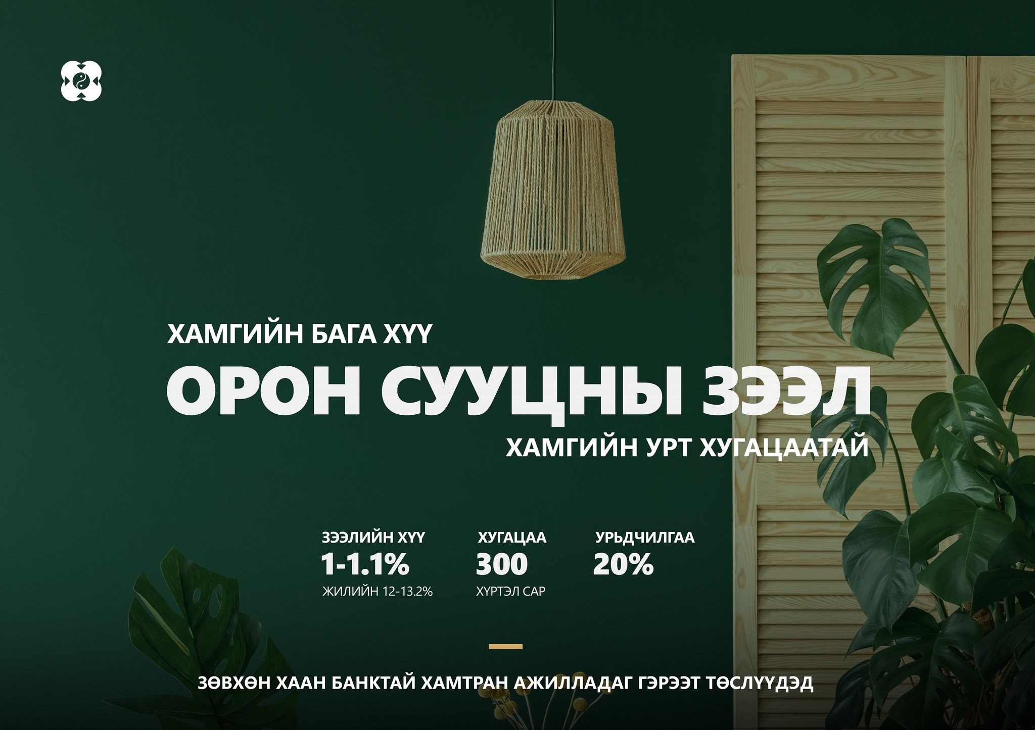 Бид онцгой нөхцөл бүхий орон сууцны зээлийн нөхцөлөө шинэчилж, 300 хүртэлх сарын хугацаатай, сарын 1-1.1% (жилийн 12-13.2%) хүүтэйгээр санал болгож байгаа юм.