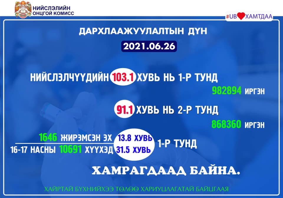 Вакцинжуулалт эхэлснээс хойш нийслэлийн 18-аас дээш насны иргэдийн 103.1 хувь буюу 982894 нь I тунд, 91.1 хувь буюу 868360 нь II тунд хамрагдаад байна. Мөн нийт 1646 (13.8 хувь) жирэмсэн эх, 16-17 насны 10691 (31.5 хувь) хүүхэд тус тус дархлаажуулалтад хамрагдаж, вакцины I тунг хийлгээд байна.