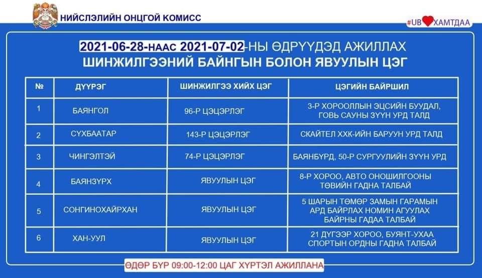2021 оны зургаадугаар сарын 28-наас долоодугаар сарын 2-ны өдрүүдэд ажиллах PCR шинжилгээний цэгийн хуваарь, байршлын мэдээллийг хүргэж байна.