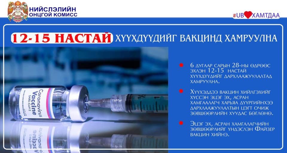 Өнөөдрөөс 12-15 насны хүүхдүүдийг эцэг эх, асран хамгаалагчийн зөвшөөрлөөр сайн дурын үндсэн дээр дархлаажуулалтад хамруулж эхэлнэ. Дархлаажуулалтад хамрагдах хүүхдүүдэд Файзер үйлдвэрийн комирнэти вакцин хийх юм.
