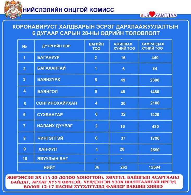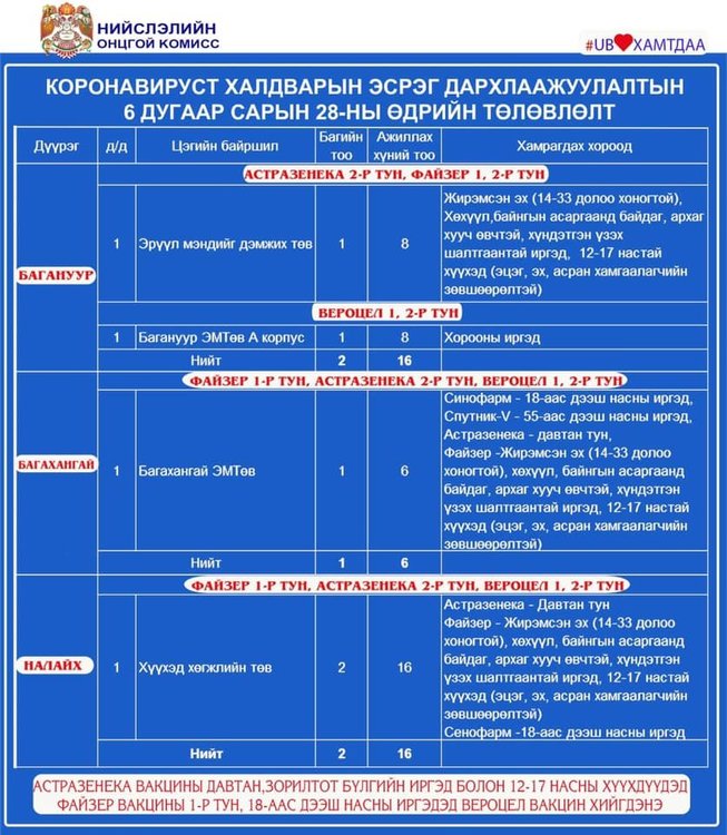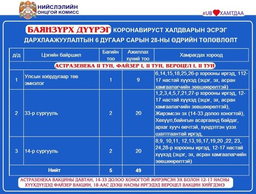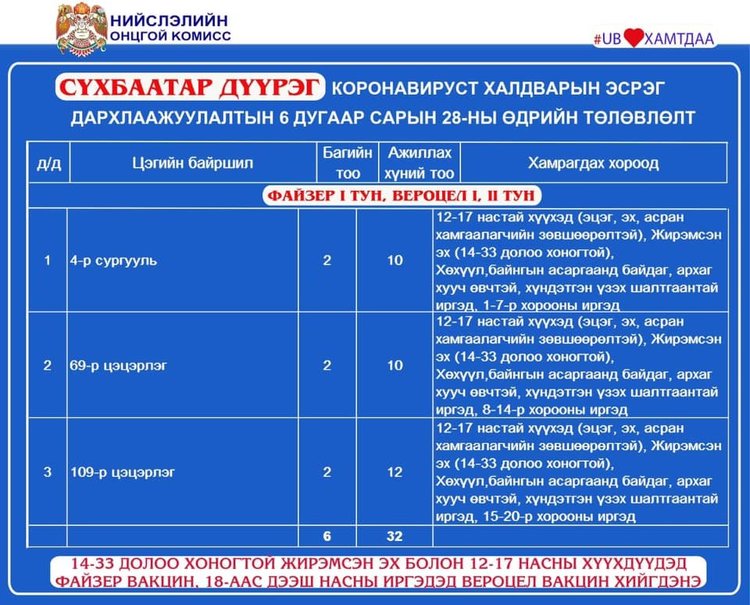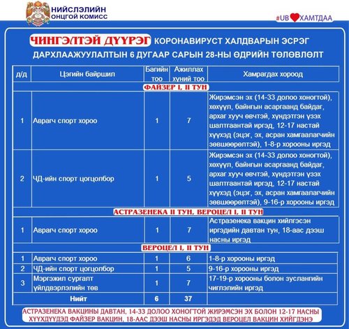 Өнөөдөр Улаанбаатар хотод 23 суурин цэгт, 36 багийн 262 эмч, ажилчид 12594 иргэнийг дархлаажуулна. Мөн шинжилгээ авах цэгүүд дараах байршлуудад ажиллана.