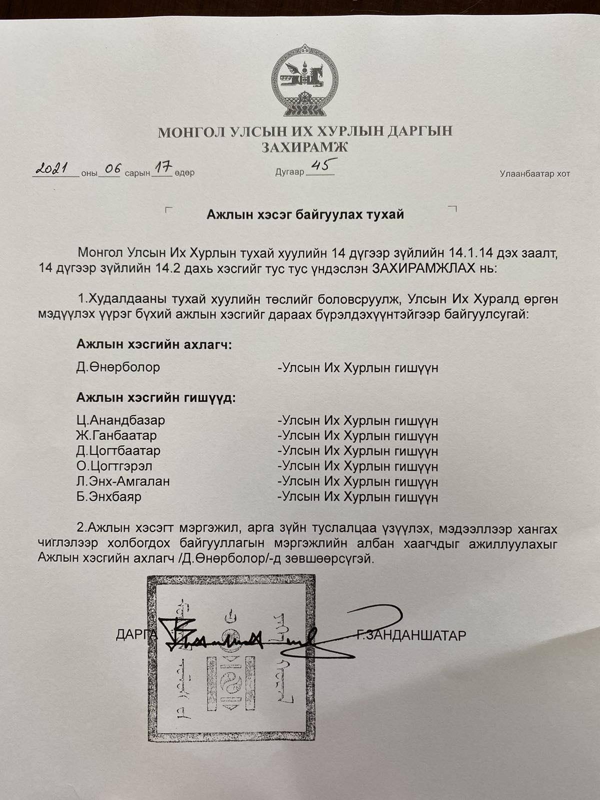 УИХ-ын дарга Г.Занданшатар захирамж гаргаж, Худалдааны тухай хуулийн төсөл боловсруулж, УИХ-д өргөн мэдүүлэх ажлын хэсгийг байгуулжээ. Ажлын хэсгийг УИХ-ын гишүүн Д.Өнөрболор ахалж, бүрэлдэхүүнд нь Ц.Анандбазар, Ж.Ганбаатар, Л.Энх-Амгалан нарын бизнесмен гишүүд багтжээ.