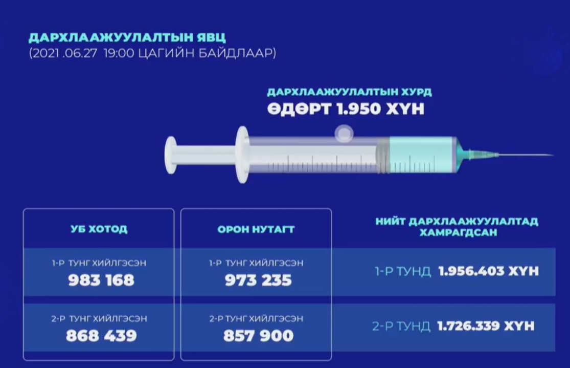 -Сүүлийн 24 цагийн хугацаанд 1 950 хүн дархлаажуулалтад хамрагджээ. Ингэснээр улсын хэмжээнд нийт нэгдүгээр тунд 1 956 403 хүн, хоёрдугаар тунд 1 726 339 хүн хамрагджээ. Өнөөдрөөс 12-17 насны хүүхдүүдийг эцэг эх, асран хамгаалагчийн зөвшөөрлөөр сайн дурын үндсэн дээр дархлаажуулалтад хамруулж эхэллээ.